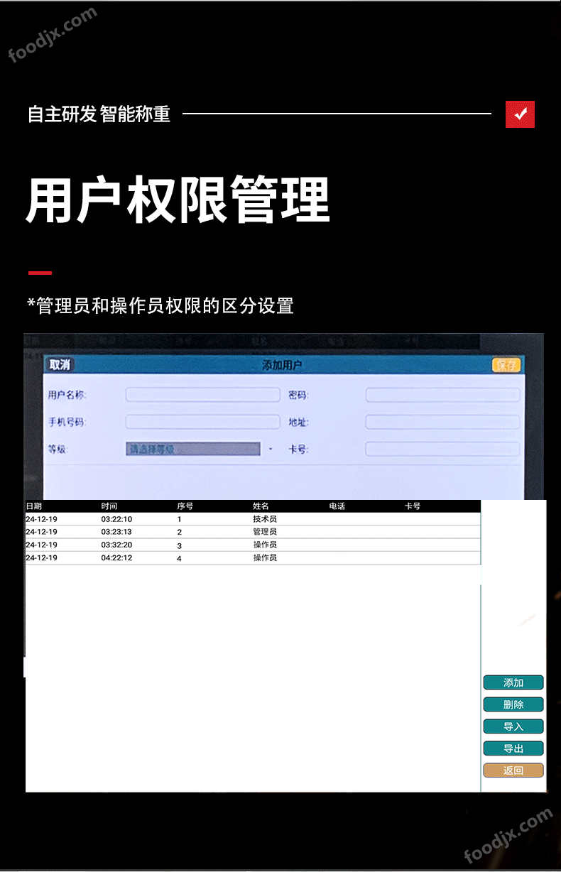 3、 配方稱具有管理員權限,管理員及操作員權限;