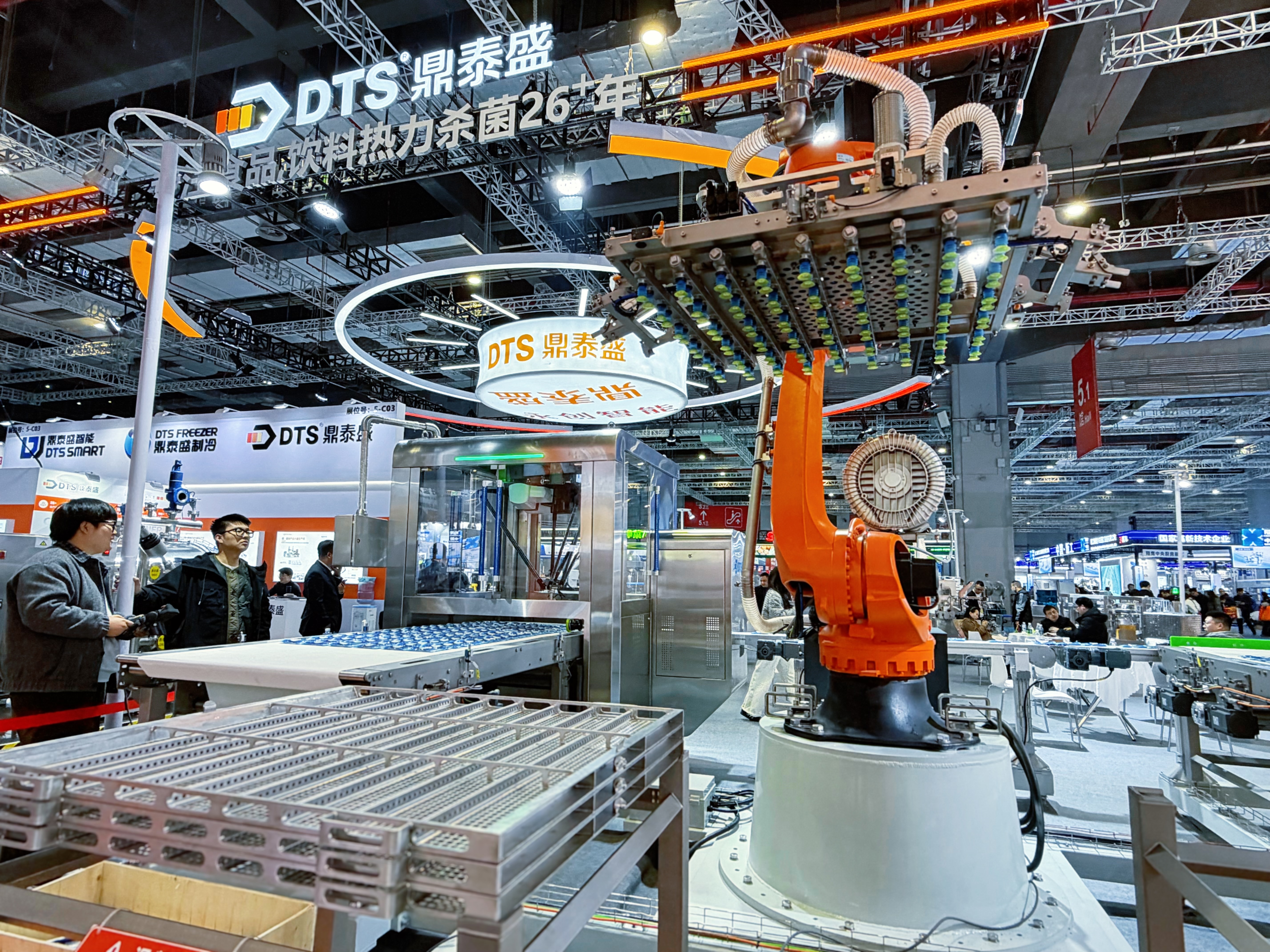 在本屆展會上,鼎泰盛重點(diǎn)展示了智能化水噴霧殺菌釜和全自動裝卸籠系統(tǒng)。其中,自動裝卸籠系統(tǒng)能夠?qū)崿F(xiàn)從裝籠、殺菌到卸籠的自動化操作,減少人工干預(yù),提高生產(chǎn)效率。