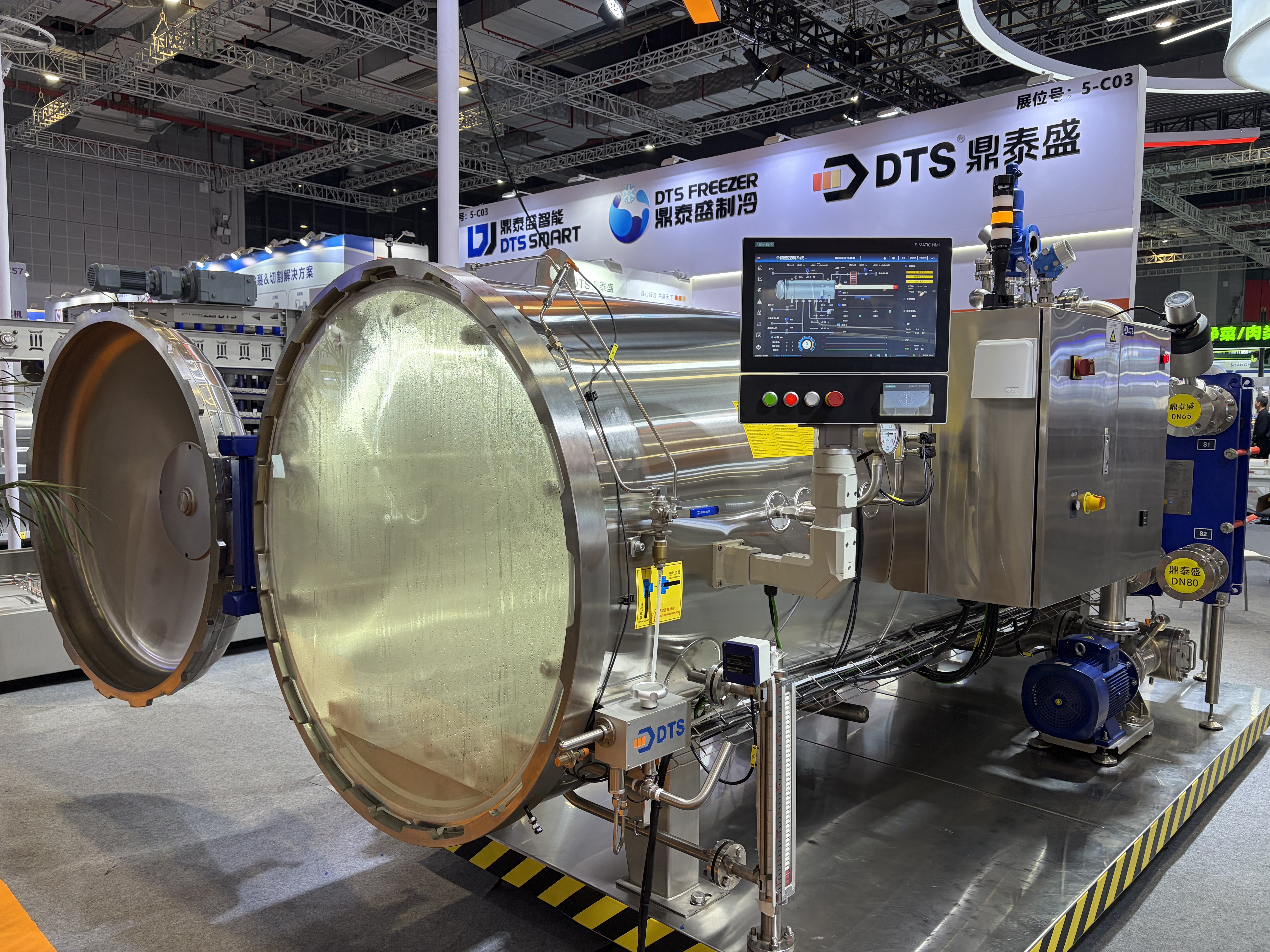 殺菌設(shè)備亮相展會。作為一家長期深耕熱力殺菌裝備領(lǐng)域的企業(yè),鼎泰盛此次參展重點(diǎn)展示了智能化水噴霧殺菌釜以及全自動裝卸籠解決方案,并圍繞食品工業(yè)化生產(chǎn)中的安全、品質(zhì)與效率問題,與行業(yè)客戶展開深入交流。