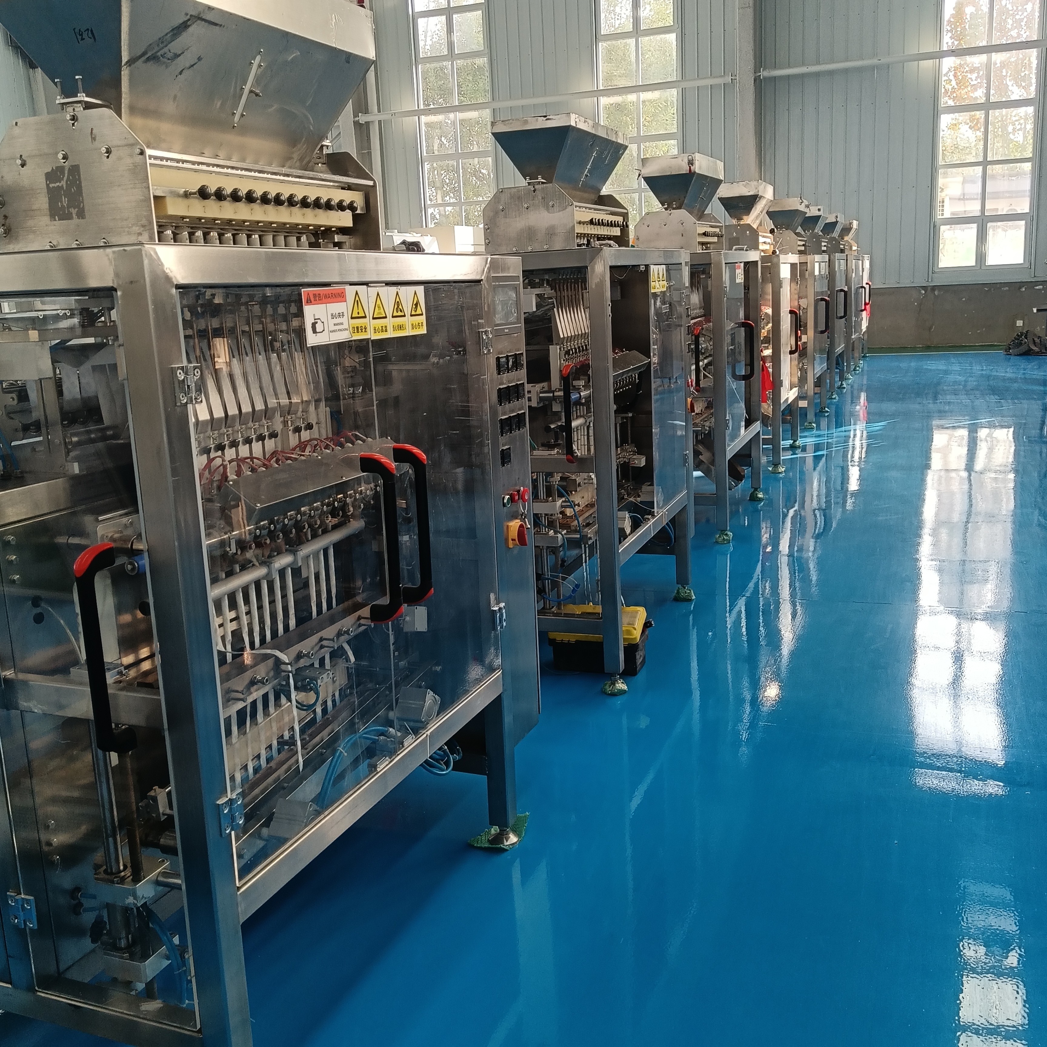 多列包裝機的核心邏輯是 **“分料 — 制袋 — 充填 — 封口 — 切斷" 同步進行 **,多條包裝線共用一套動力和控制系統,具體步驟如下: