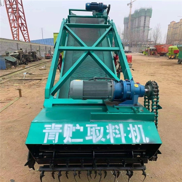 根據牛場的實際生產需求,設計出一款全新的青貯取用設備,它直接放置在青貯窖中,由取料滾筒將青貯草打到輸送帶上,再由輸送帶將青貯料直接裝入攪拌車或其他一些運載工具,全部工作只需一個工人就可輕松完成。