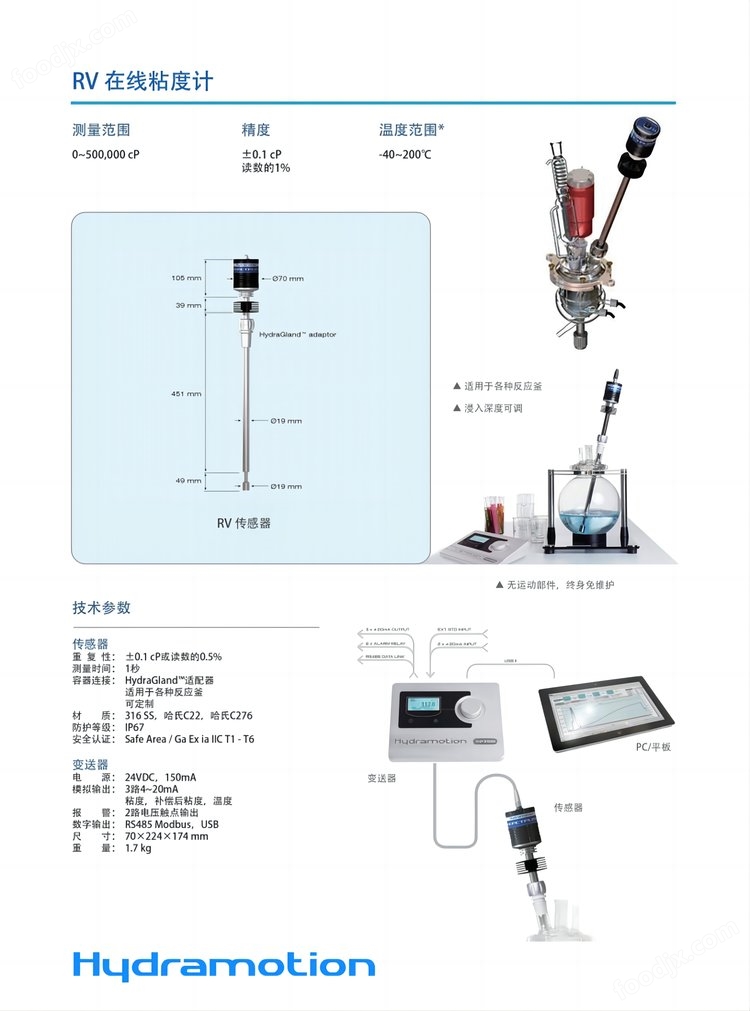 Hydramotion公司生產的在線粘度計可用于任何粘度量程及任何流體的粘度測量,相比使用傳統的離線粘度監測方法(取樣測試),在線粘度計監測下,可觀測到反應過程中粘度隨時間變化的曲線,粘度是分子量的標志,因此該方法的關鍵在于解決了聚合反應終點的準確確定。該設備對粘度微小變化有很高的敏感。即使是在某些很苛刻的條件下,也可得到所期盼的準確度,而且有母系的可安裝的或手提式設備可供固定或便攜安裝。動力及運動粘度可以在任何常規單元中顯示相關的參數(例如參考一個特殊溫度的粘度)也可以獲得。